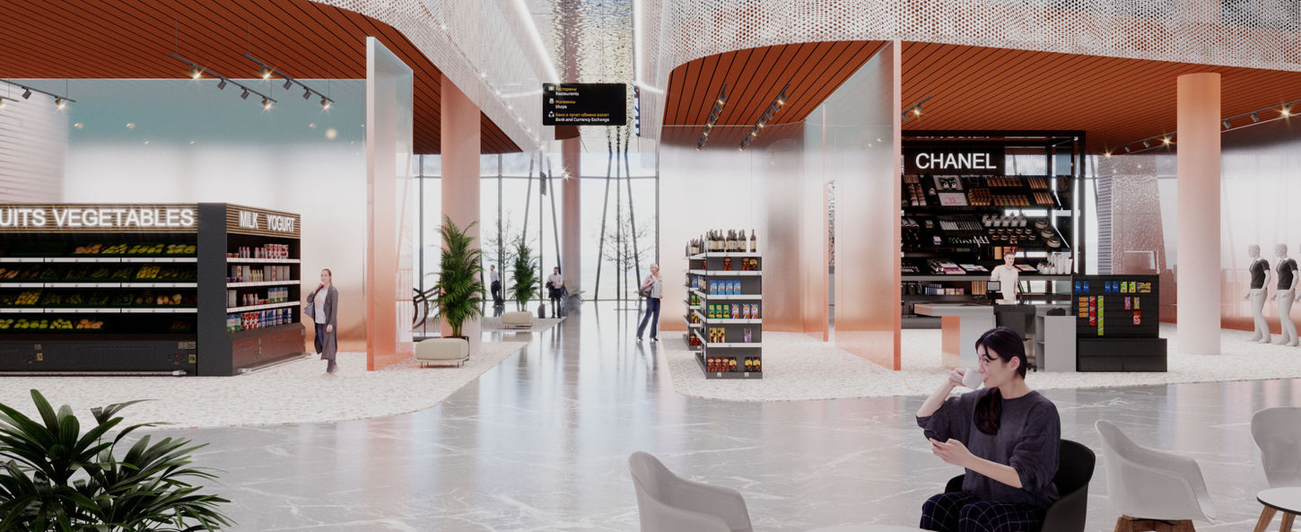 При разработке интерьеров аэропорта были предложены несколько вариантов исполнения, вдохновленные природой Ставропольского края: минеральный источник, туман, цвет горных пород и форма воды.